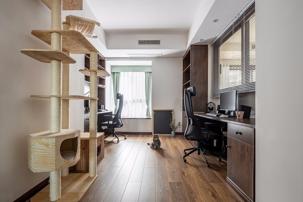 書房,貓爬架滿足了貓咪的娛樂,兩個書桌的設(shè)計,為愛打游戲更愛工作的屋主提供一個自由而愜意的空間。書房與客廳打通之后,采光通風(fēng)都增強了不少。百葉窗簾具有良好的透氣性和隱私性,還可以提升空間的顏值與氣質(zhì)。