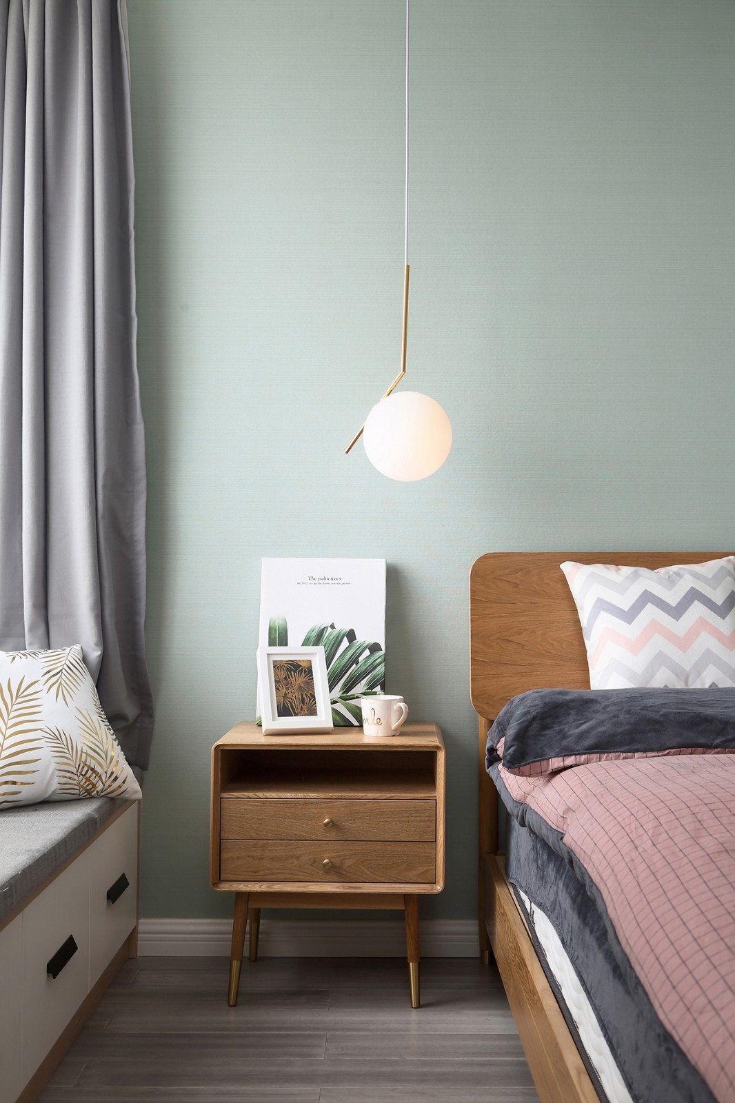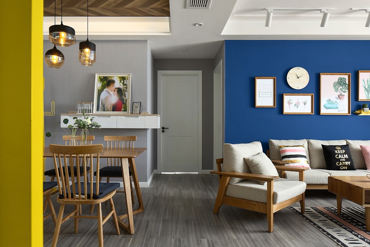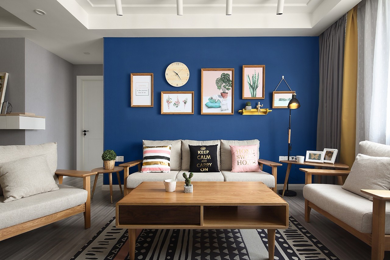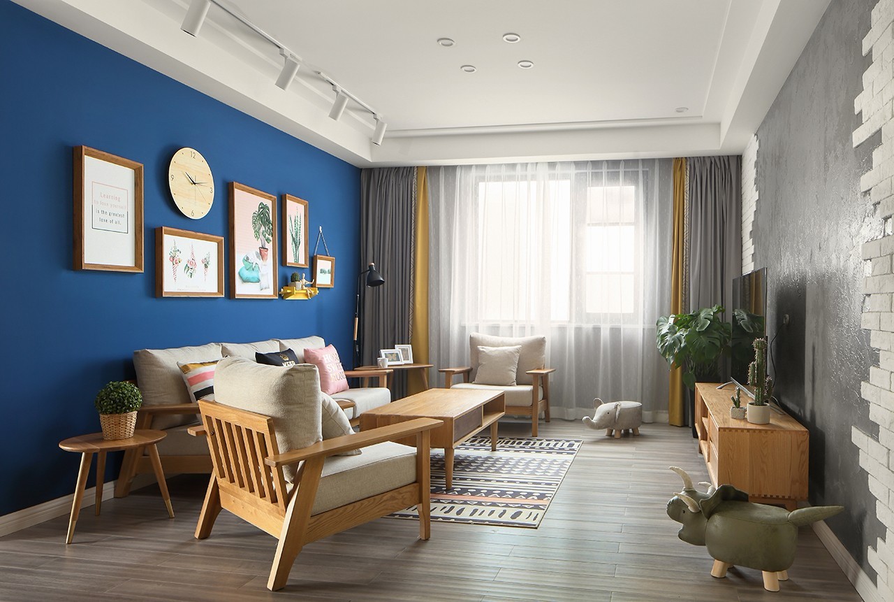 原木色布藝沙發(fā)撞色深藍色墻布的背景,突出木作家居給予空間的原生態(tài)環(huán)境