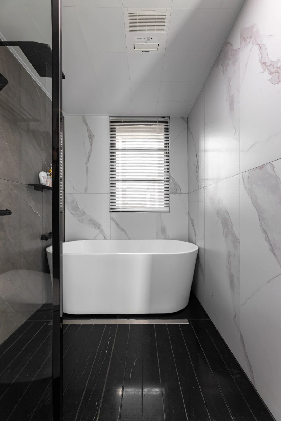 淋浴區(qū)地面做成石材拉槽設(shè)計(jì),下水快又防滑,墻面的壁龕可放置洗浴用品,節(jié)省空間,拿取又方便。