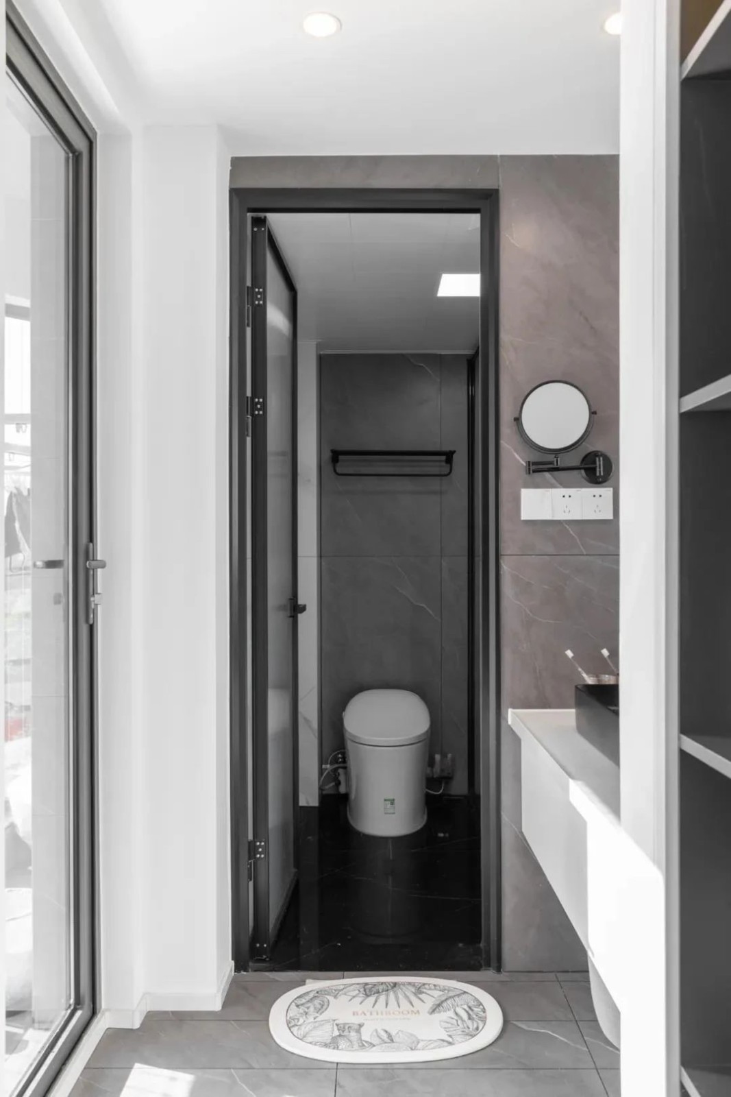 衛(wèi)生間與小陽(yáng)臺(tái)之間用玻璃門分隔,增加暗衛(wèi)的采光和通透性。