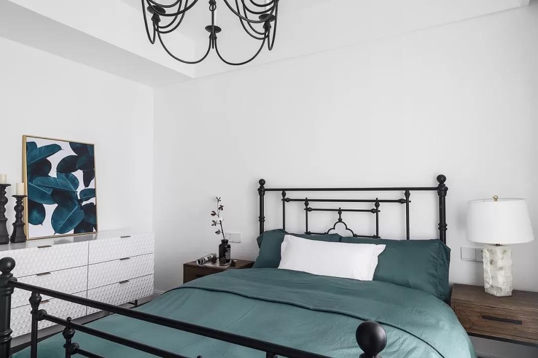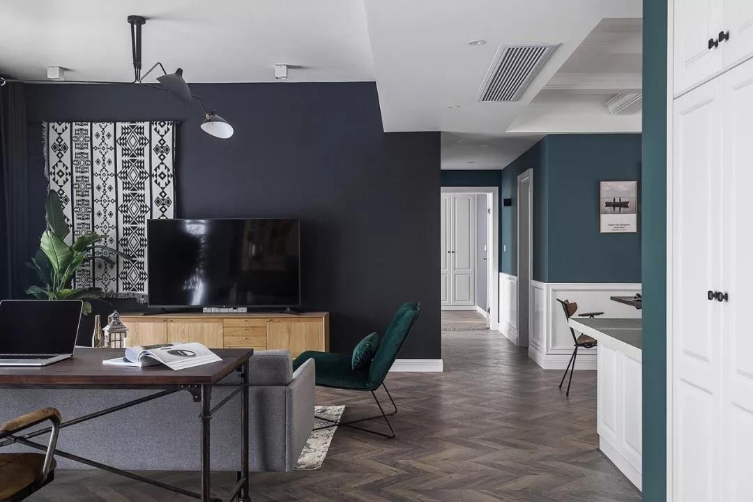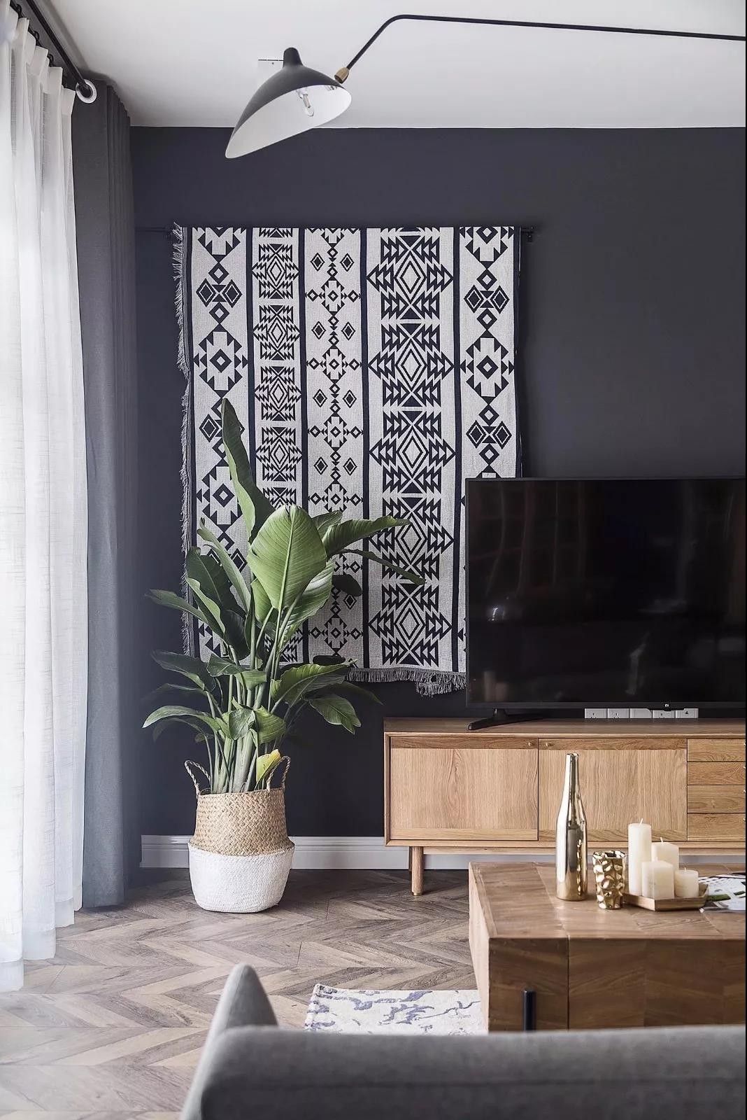 電視墻的設(shè)計(jì)也很有特色,在偏左的地方掛上一塊黑白相隔的毯子,在深灰色的電視墻上做了一個(gè)視覺沖擊的一個(gè)設(shè)計(jì),讓電視墻看起來不單調(diào),有個(gè)性。