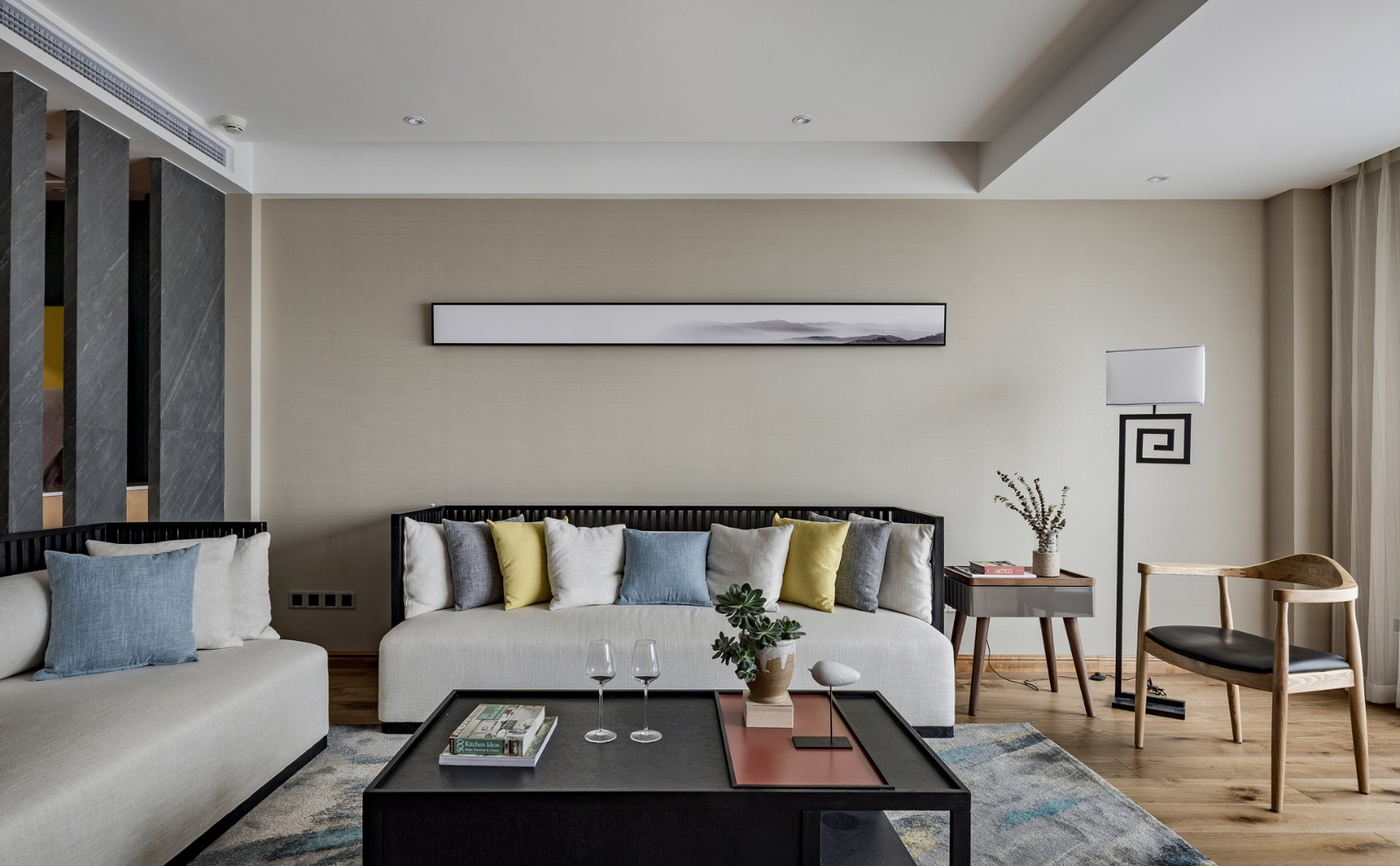 沙發(fā)背景墻珍珠白乳膠漆,新中式特有的落地?zé)簦?jiǎn)單的一副山水掛畫(huà)就能體現(xiàn)業(yè)主的品味。