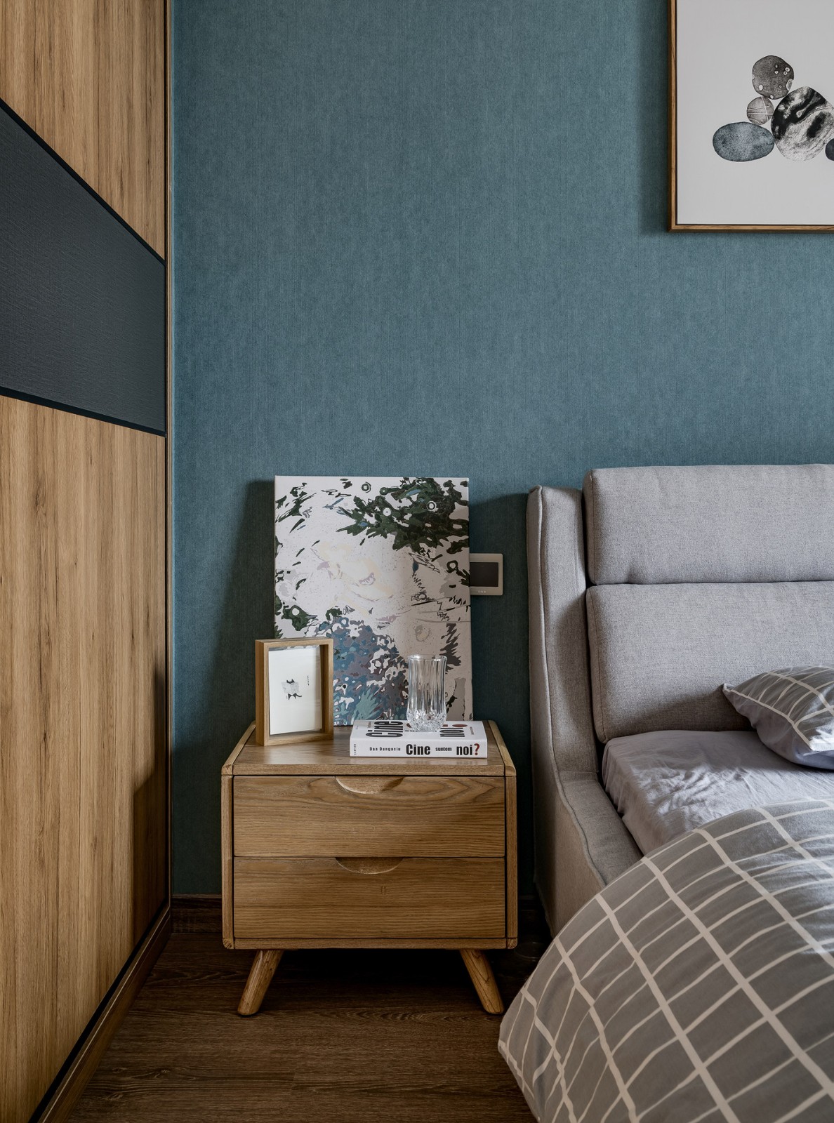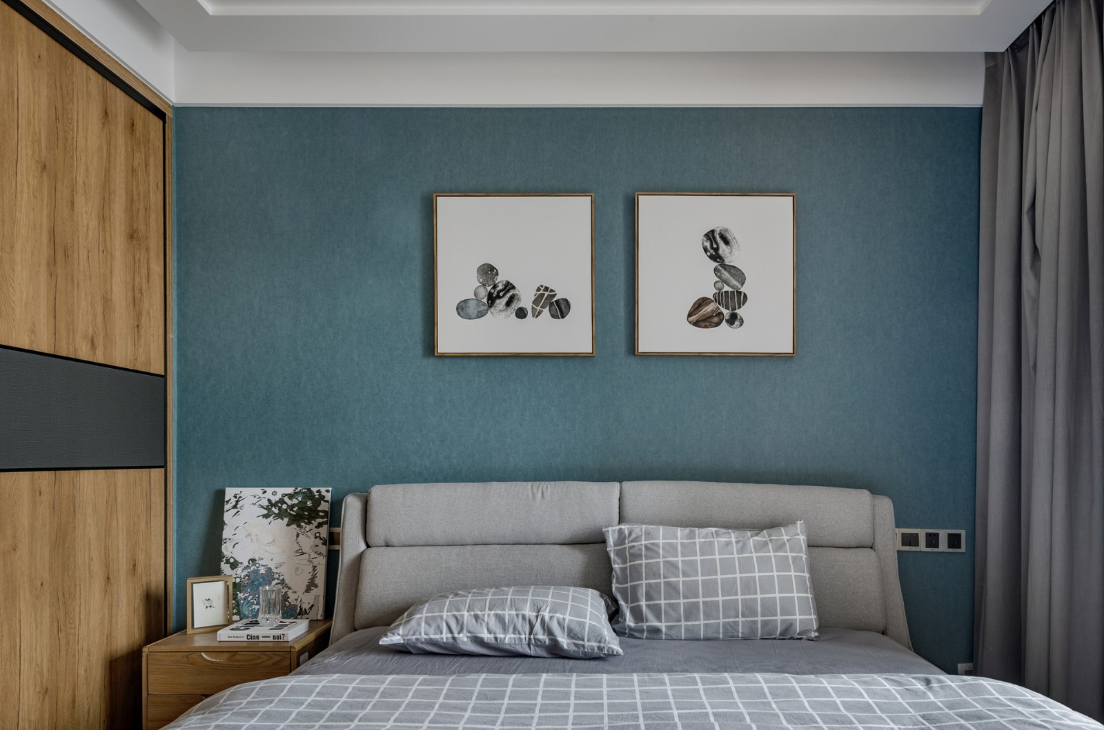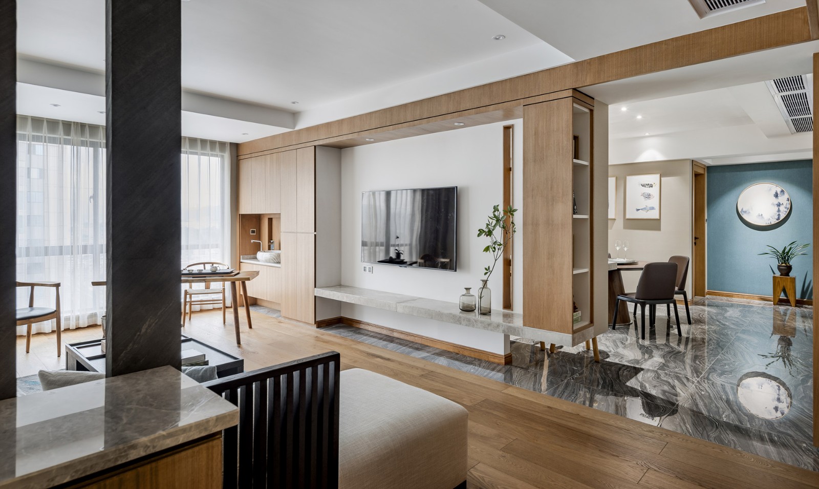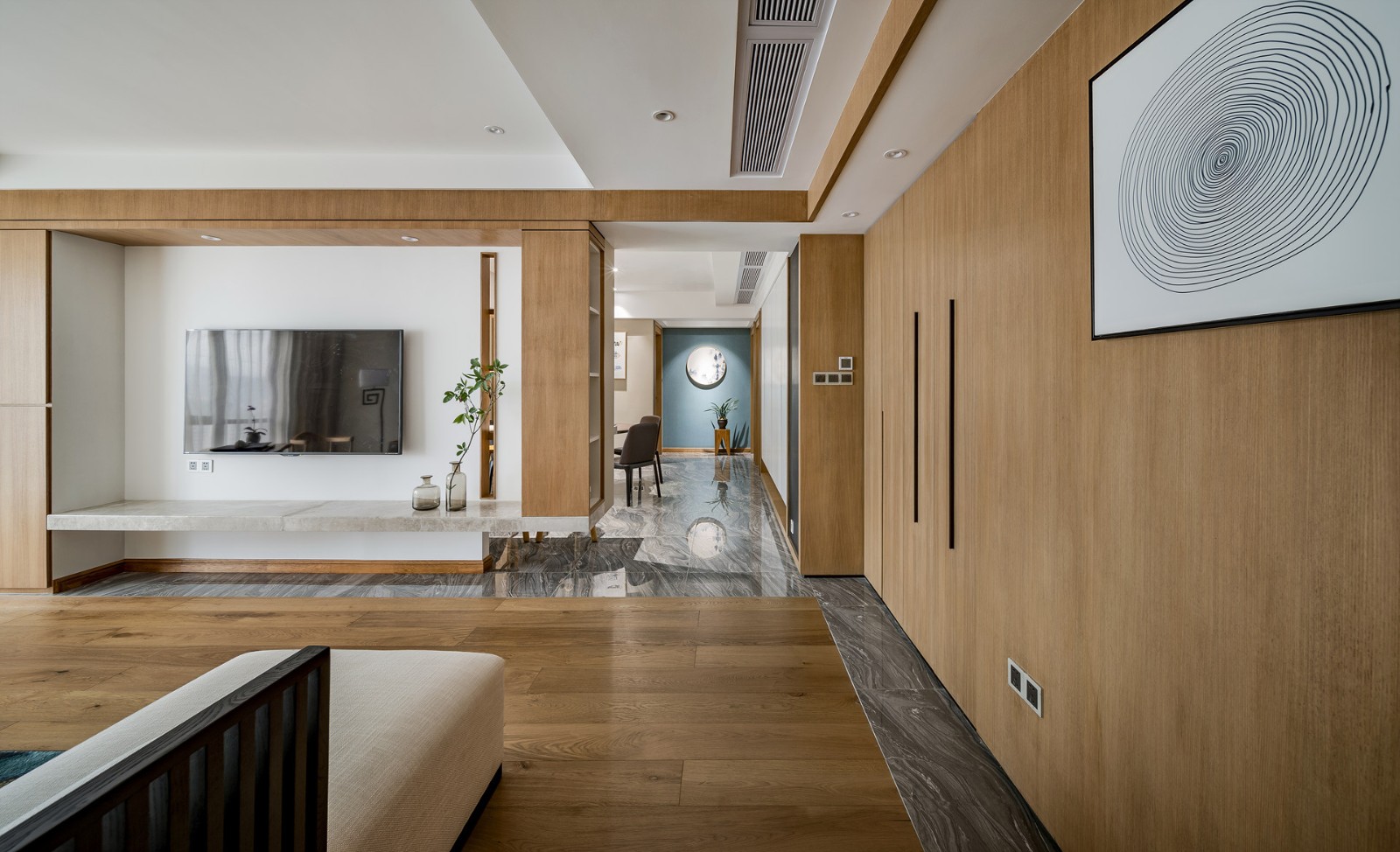電視背景墻采用原木、大理石、乳膠漆加一點(diǎn)綠植,返璞歸真的生活感受。